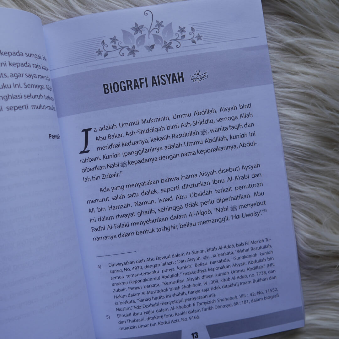 Aisyah radhiyallahu ‘anha adalah istri Nabi Muhammad shallallahu ‘alaihi wasallam yang paling beliau cintai sebagaimana disampaikan dalam buku ini. Ia memiliki banyak keutamaan dan keistimewaan yang tidak dimiliki istri-istri beliau yang lain. Diantaranya adalah Aisyah merupakan satu-satunya istri Nabi shallallahu ‘alaihi wasallam yang perawan, Allah Ta’ala menurunkan dari langit pembebasannya dari tuduhan keji, wahyu turun kepada Nabi shallallahu ‘alaihi wasallam saat beliau berada dalam selimut bersama Aisyah, Allah Ta’ala mencabut nyawa Nabi shallallahu ‘alaihi wasallam saat berada dalam dekapan Aisyah, dan beliau shalallahu ‘alaihi wasallam dimakamkan di rumah Aisyah radhiyallahu anha.